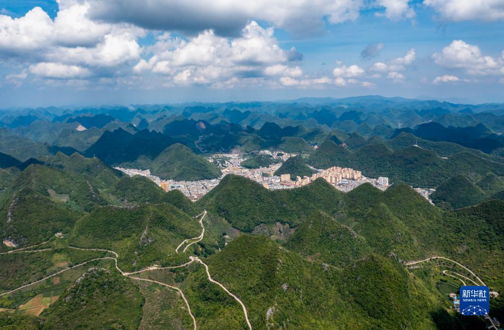 這是無人機視角下的西疇縣山間公路一景,遠處是縣城(無人機照片,7月26日攝)。