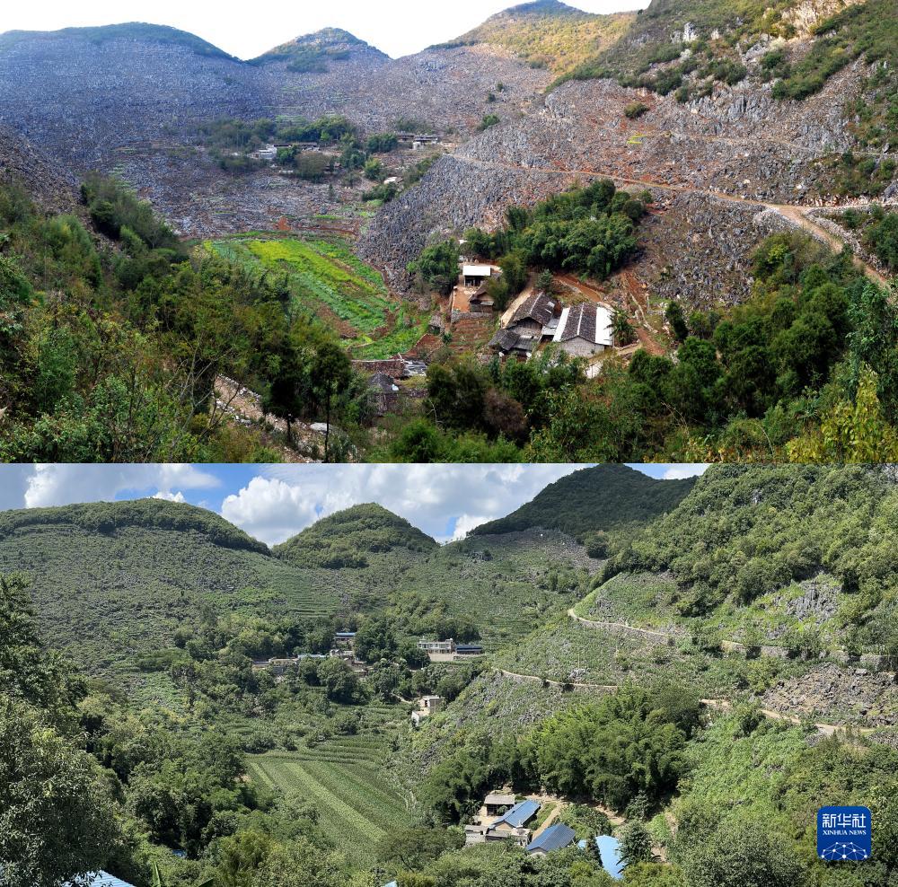 這是一張拼版照片:上圖為1991年拍攝的西疇縣大鄔麻村改造前的石漠化情況(西疇縣融媒體中心供圖);下圖為2023年7月26日拍攝的西疇縣大鄔麻村改造后的情況(新華社記者費茂華攝)。新華社發