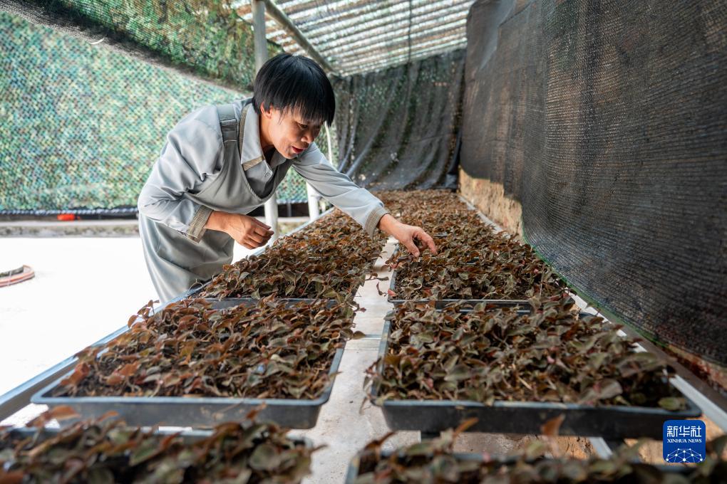 謝成芬在家中搭建的大棚內打理人工種植的金線蓮植株(7月27日攝)。新華社記者 陳欣波 攝