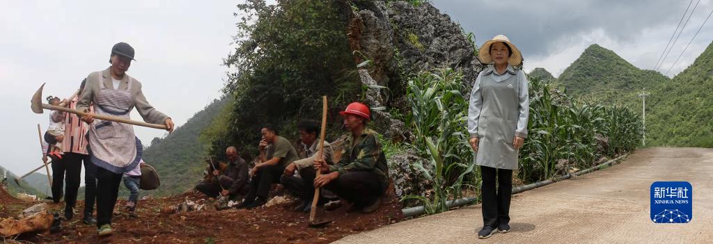 這是一張拼版照片:左圖為2009年謝成芬(前左)帶領村民一起修路時的資料照片(西疇縣融媒體中心供圖);右圖為2023年7月27日,謝成芬站在修好的出村公路上(新華社記者費茂華攝)。新華社發