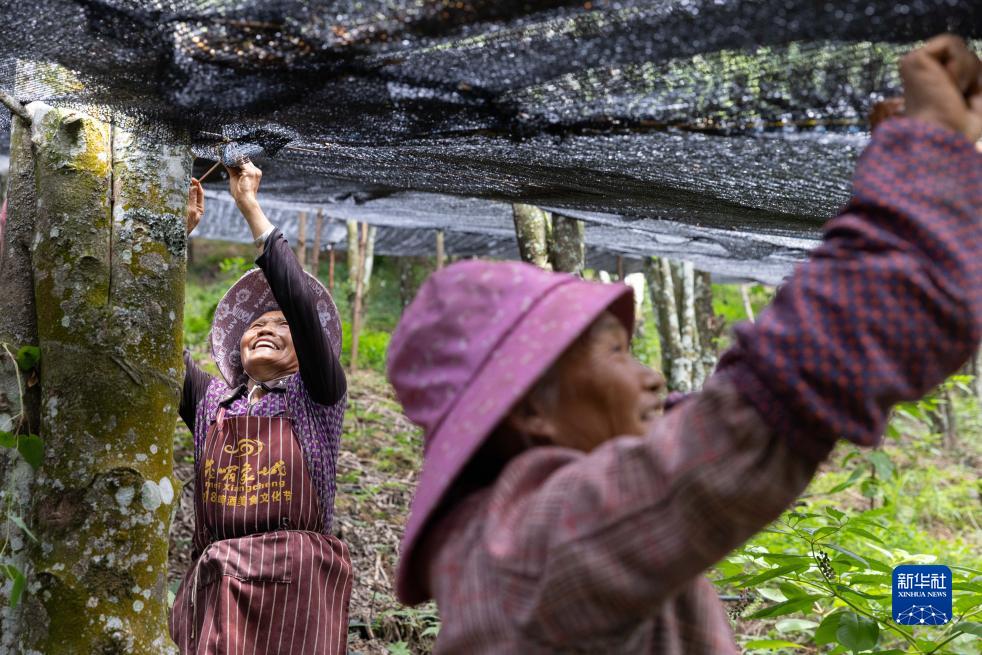 7月27日,工作人員在云南西疇縣西灑鎮的中藥材基地修補遮陽網。新華社記者 呂帥 攝
