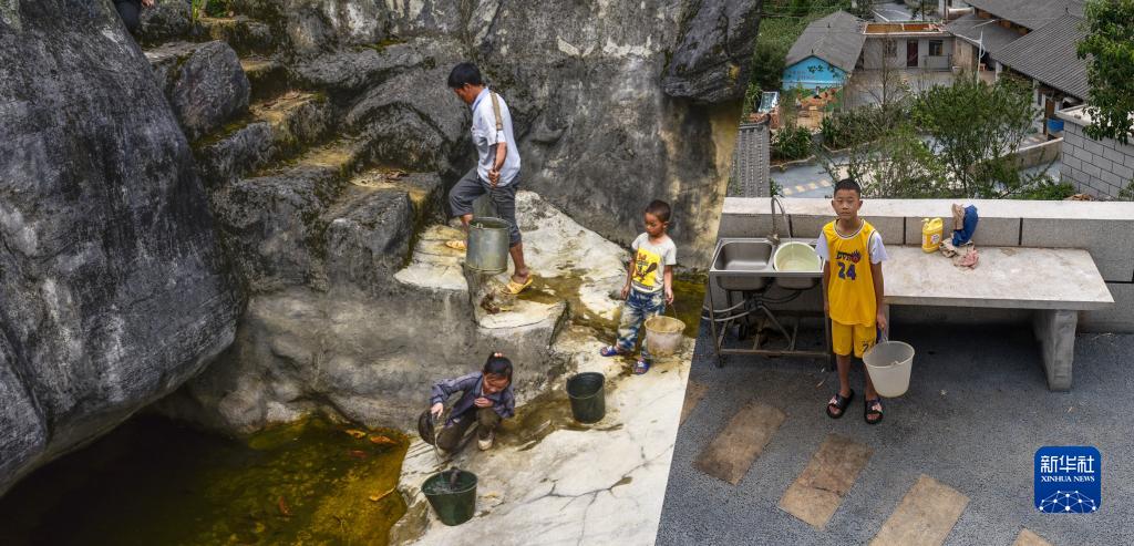 這是一張拼版照片:左圖為2014年拍攝的西疇縣巖頭村村民在石頭凹里取水,這些水是下雨時積的,當時小村民李大鑫(右)只有5歲(西疇縣融媒體中心供圖);右圖為2023年7月26日拍攝的西疇縣巖頭村村民李大鑫在自己家的院子里接自來水(新華社記者費茂華攝)。新華社發