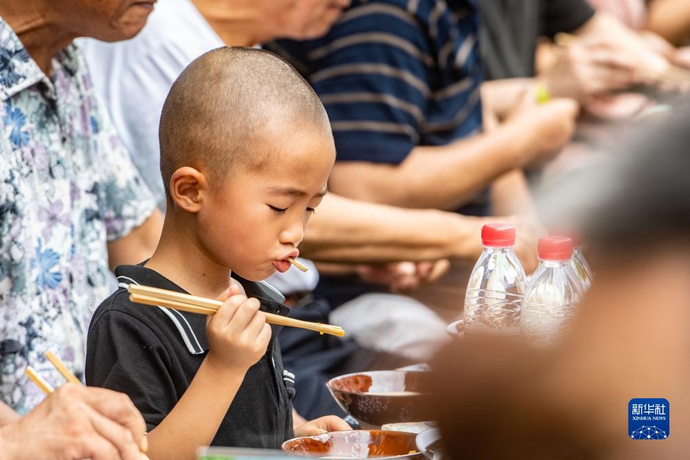 7月29日,在重慶市綦江區安穩鎮,小朋友在“苗家伏羊節”上吃長桌宴。