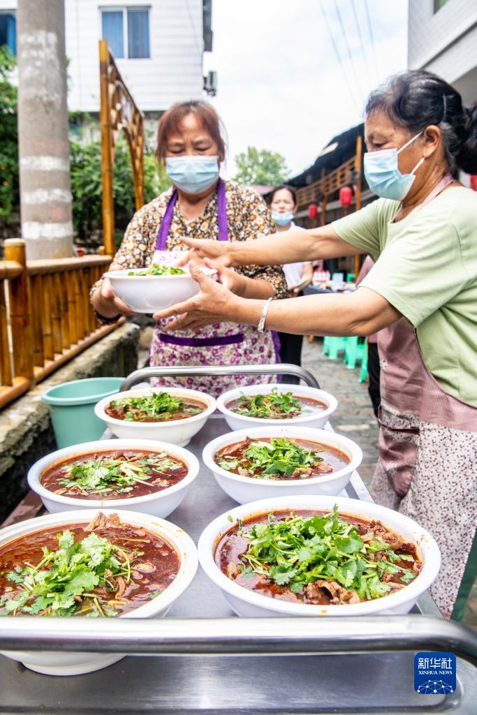 7月29日,在重慶市綦江區安穩鎮,當地居民在“苗家伏羊節”上準備羊肉長桌宴。