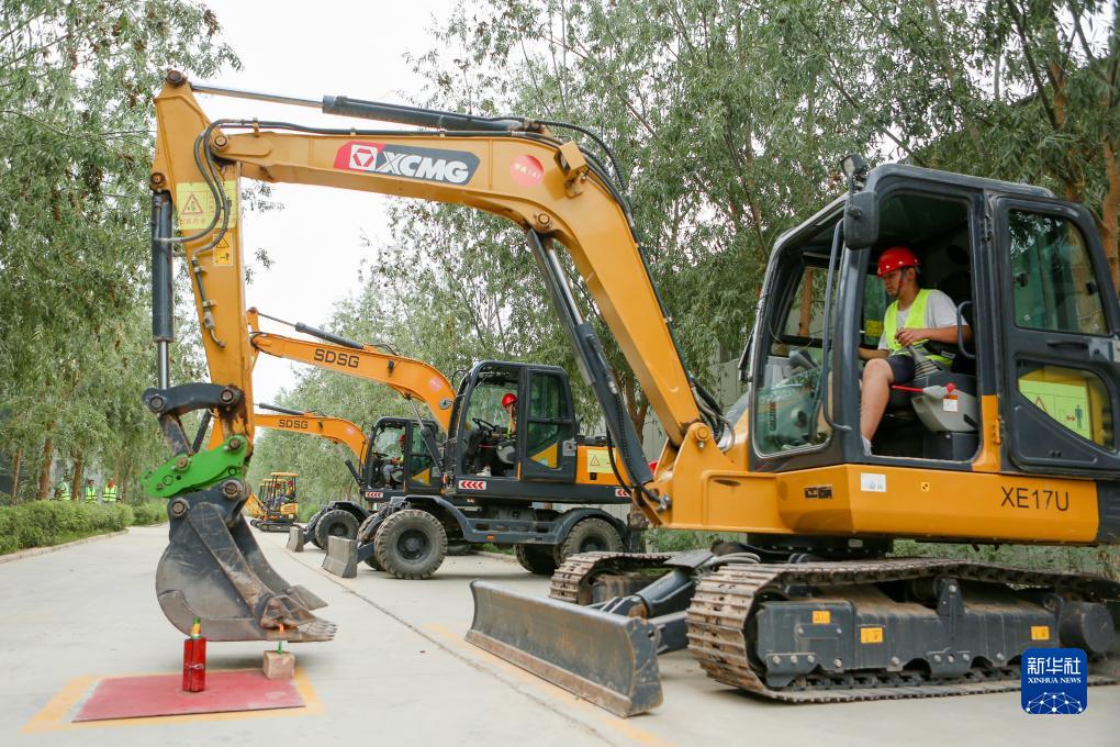 7月29日,在第二屆新疆建筑工匠技能大賽決賽現場,挖掘機手在展示挖掘機開打火機技能。