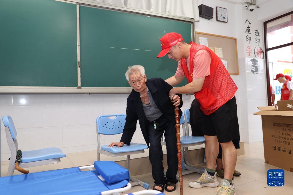 7月29日,在福建省廈門市新圩學校臨時安置點,志愿者攙扶一名行動不便的老人。