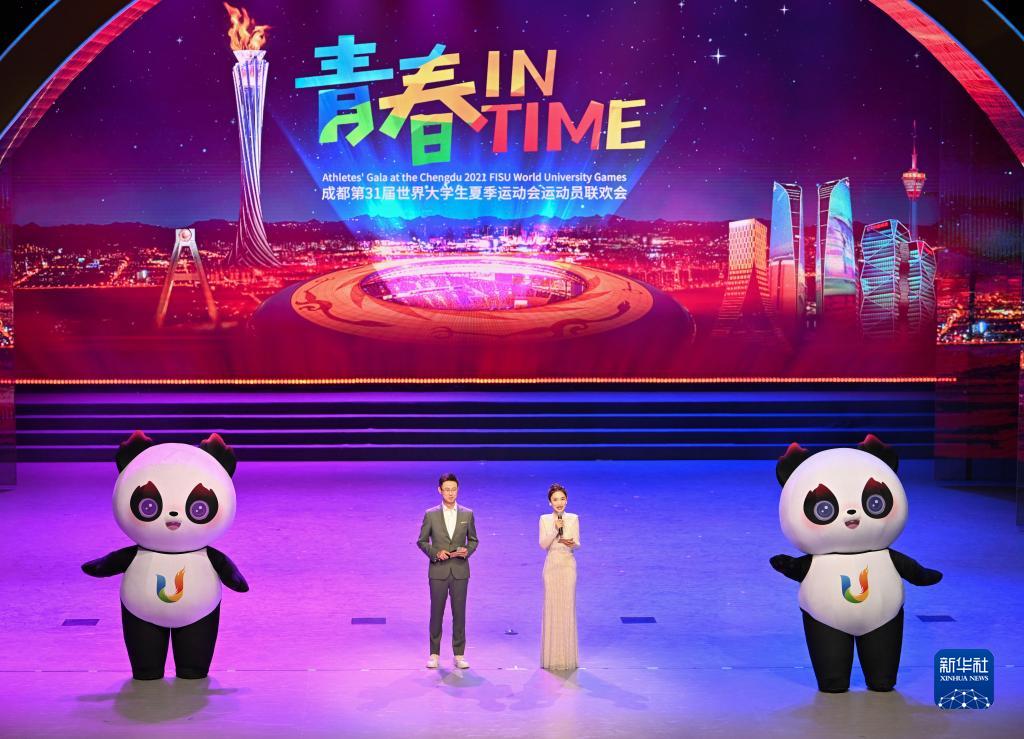 當晚,“青春 In Time”第31屆世界大學生夏季運動會運動員聯歡會在成都大運村藝術中心大劇場舉辦。聯歡會以魔術、舞蹈、演唱等藝術形式為橋梁,推動中外青年藝術家、運動員、大學生及志愿者代表互動交流,營造歡樂、友愛的大運氛圍。新華社記者 蔡湘鑫 攝