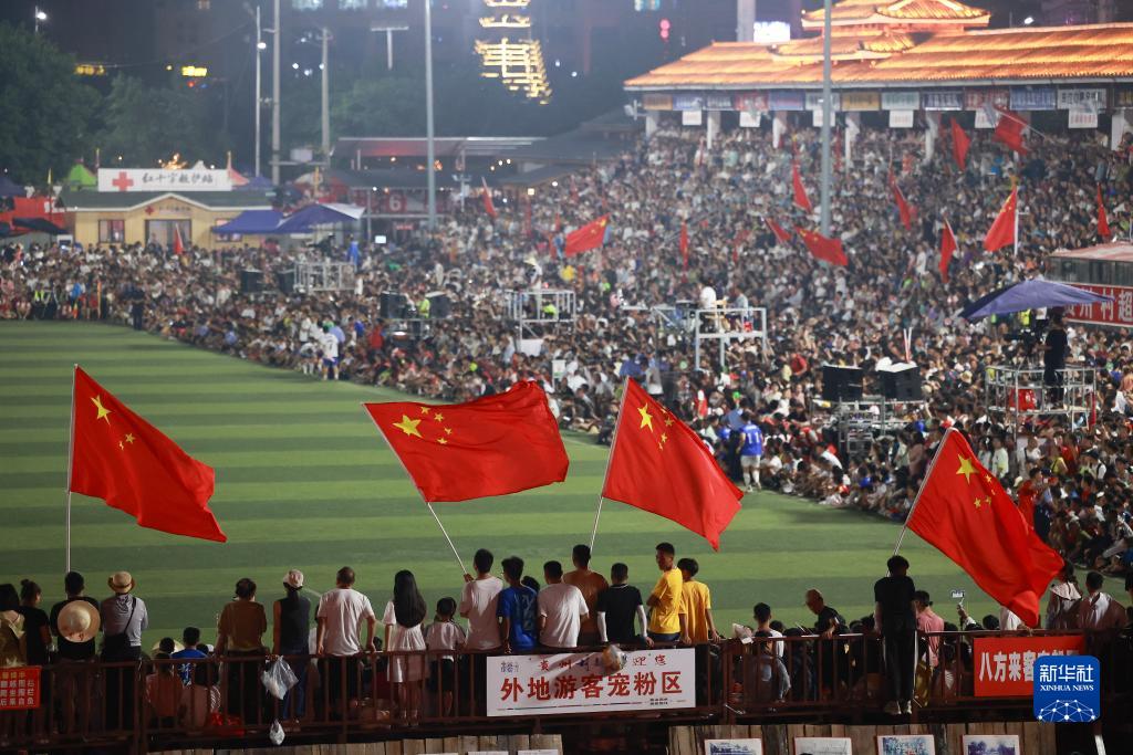 7月29日,觀眾們在現場揮舞國旗。新華社記者 劉續 攝
