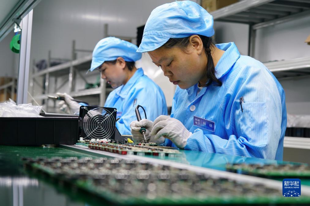 7月29日,河北省平鄉縣一家童車生產企業的員工在組裝電動童車控制器。