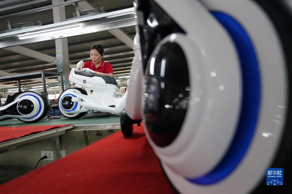 7月29日,河北省平鄉縣一家童車生產企業的員工在組裝電動童車。