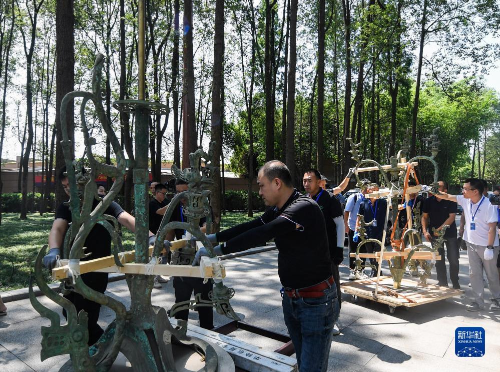 在三星堆博物館,工作人員將Ⅰ號大型銅神樹運往新館(7月17日攝)。