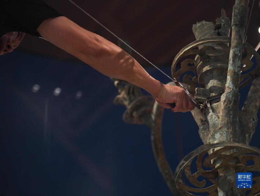 在三星堆博物館老館,工作人員剪斷Ⅰ號大型銅神樹頂部的固定線(7月16日攝)。