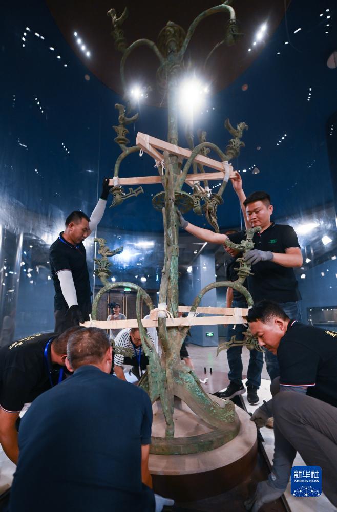 在三星堆博物館老館,工作人員準備將Ⅰ號大型銅神樹移出玻璃罩(7月16日攝)。