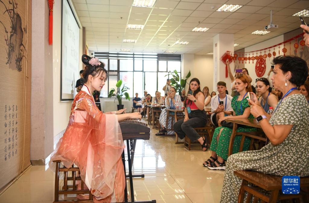 烏魯木齊古箏愛好者在新疆圖書館為外國歌舞團演員演奏《漁舟唱晚》(7月23日攝)。