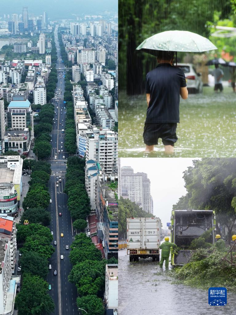 這是一張拼版照片:左圖為7月30日拍攝的福州市晉安區福新路,路上積水已退去,交通秩序恢復暢通(無人機照片);右上圖為7月29日,位于福州市晉安區福新路上的某小區積水嚴重,一名市民涉水回家;右下圖為7月29日,工作人員在福州市晉安區福新路上清理被臺風刮倒的樹木。