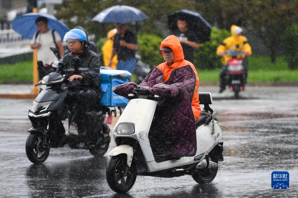 7月30日,在北京市朝陽區,人們冒雨出行。