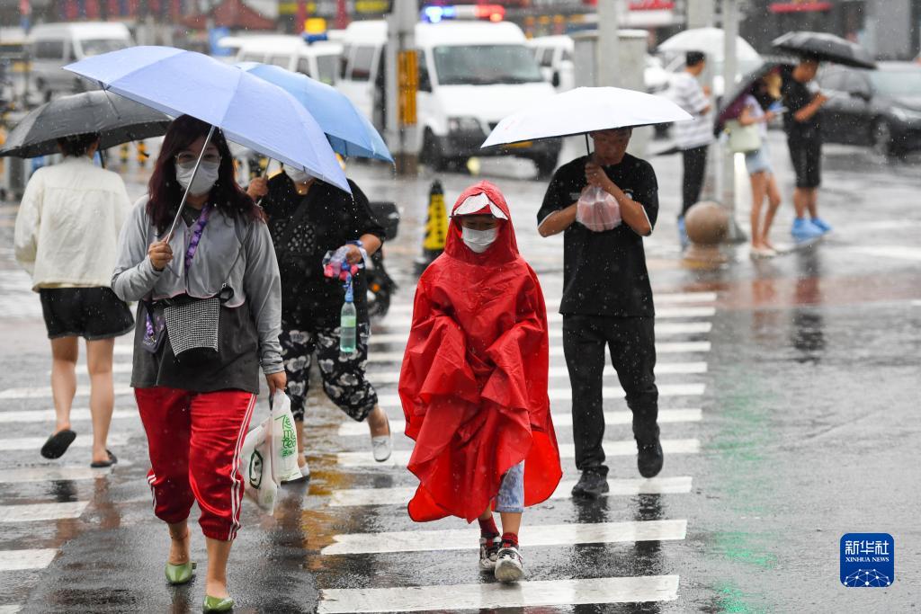 7月30日,在北京市朝陽區,行人冒雨行走在路上。