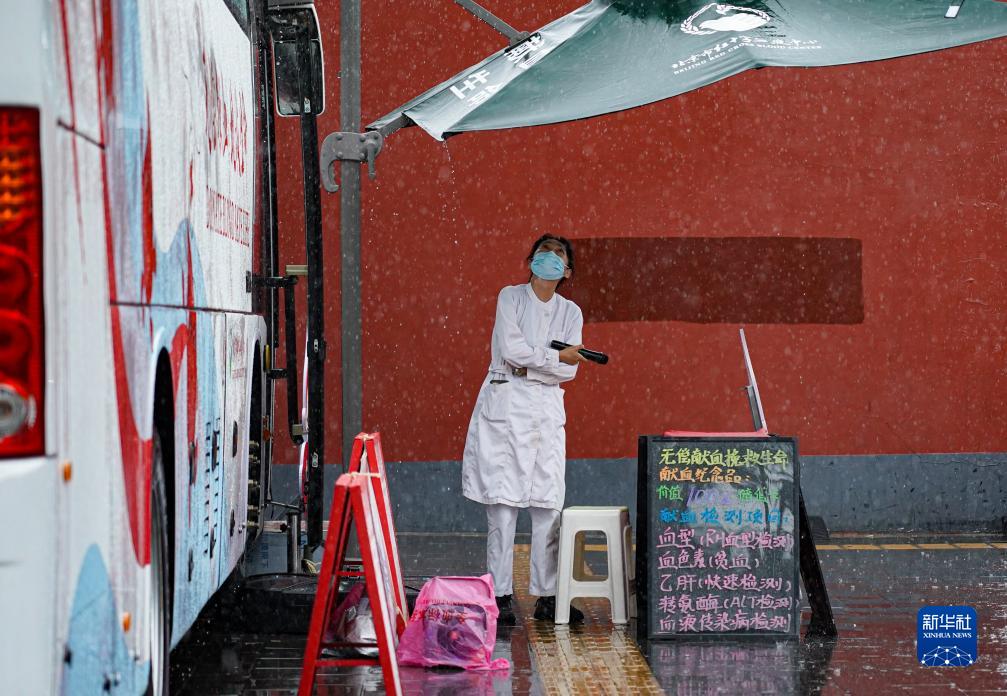 7月30日,在北京雍和宮大街一處獻血車前,值班人員抬頭觀察雨勢。