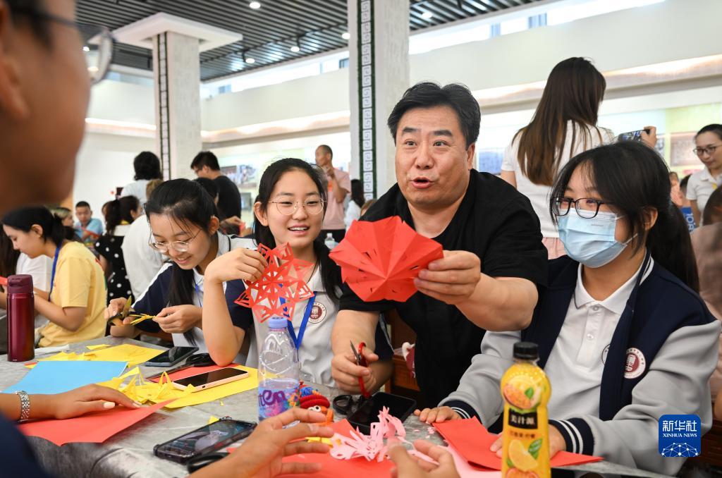 7月30日,剪紙藝術家段建珺(右二)在活動中向呼和浩特市第二中學學生介紹剪紙技藝。