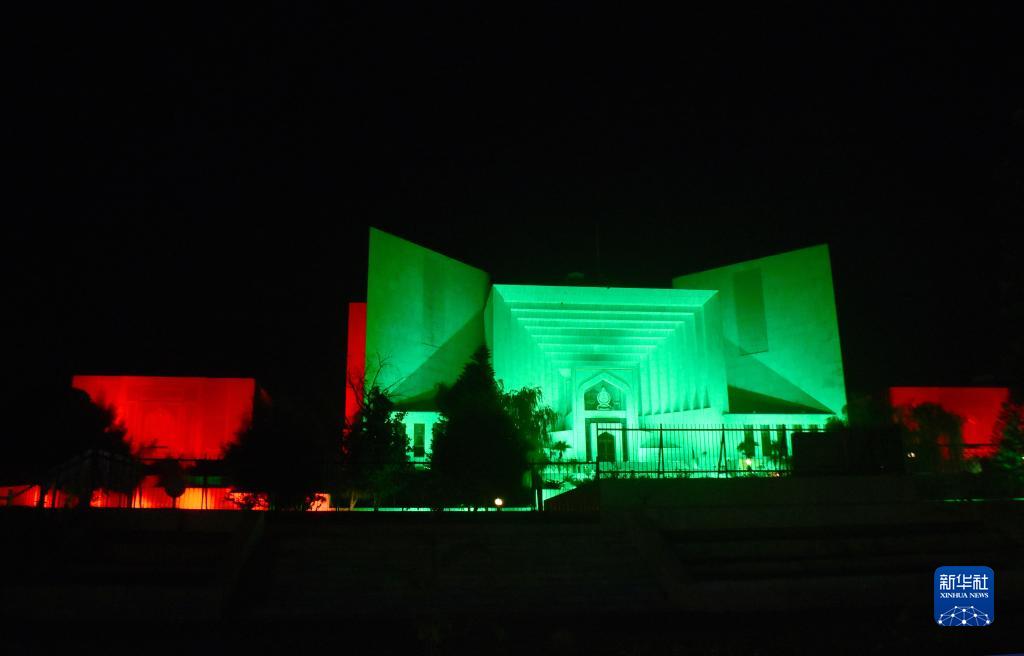 近日,巴基斯坦首都伊斯蘭堡地標建筑亮起中巴兩國國旗顏色燈光,慶祝中巴經濟走廊啟動十周年。
