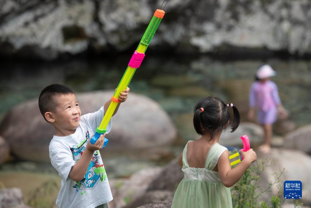 7月30日,在湖南省永州市道縣清塘鎮小塘村大江源親水區,小朋友在戲水玩耍。