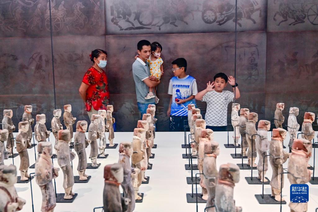 7月30日,家長帶領小朋友在山東省青州市博物館參觀文物展覽。