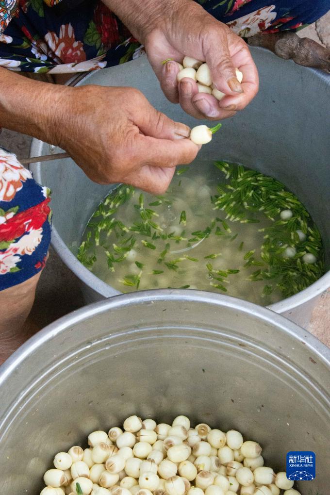 7月31日,在湖南省湘潭縣花石鎮羅漢村一湘蓮加工基地,當地村民在給湘蓮去芯。