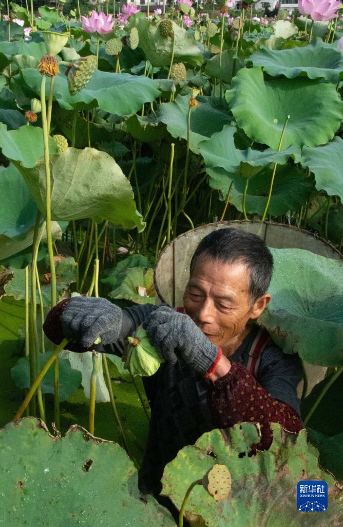 7月31日,在湖南省湘潭縣花石鎮羅漢村湘蓮種植基地,當地蓮農在采摘湘蓮。