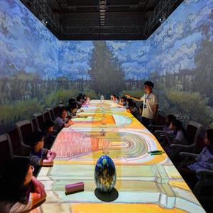 7月30日,在天津數字藝術博物館,學生們沉浸式參觀油畫藝術作品。