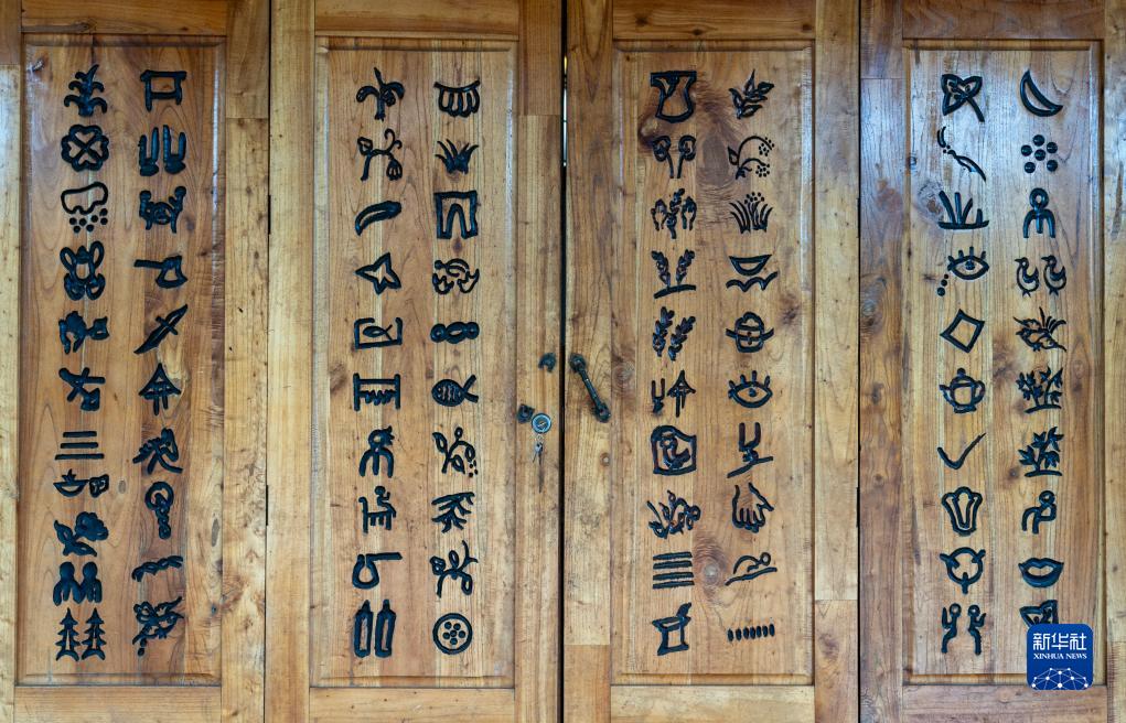 這是7月30日拍攝的刻在坡芽村坡芽傳習館門板上的81個“坡芽情歌”圖畫符號。