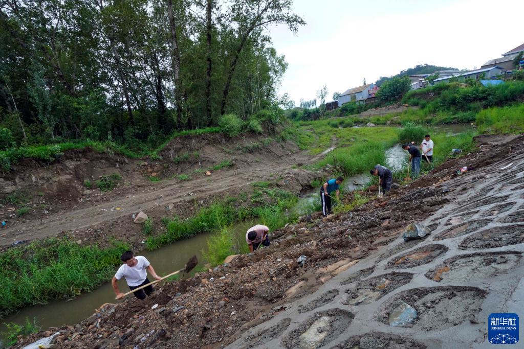 7月31日,河北省遵化市羅文峪村農民在加固河壩。
