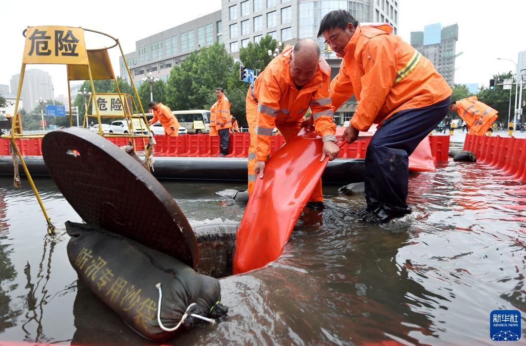 7月31日,在河北省石家莊市中山西路一積水路段,工作人員進行緊急排水。