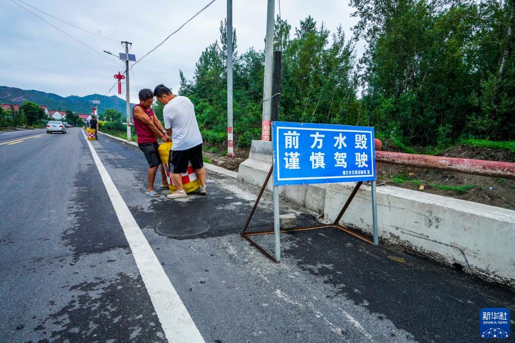7月31日,工作人員在河北省遵化市羅文峪村南側設置車輛通行提示標志。