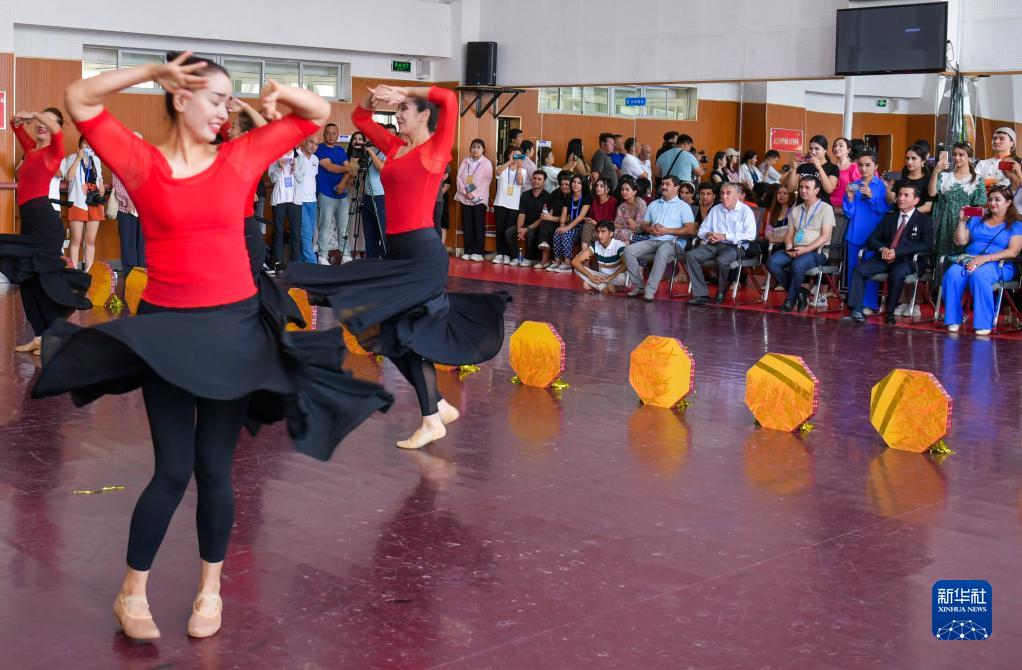 當日,在烏魯木齊參加第六屆中國新疆國際民族舞蹈節的塔吉克斯坦羅拉國家功勛歌舞團走進新疆藝術劇院,雙方演員在音樂、舞蹈等方面進行交流,展示絢麗多姿的風采。