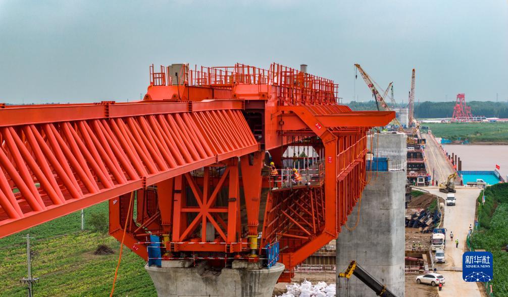 7月31日拍攝的雄商高鐵黃河特大橋主橋施工現場(無人機照片)。
