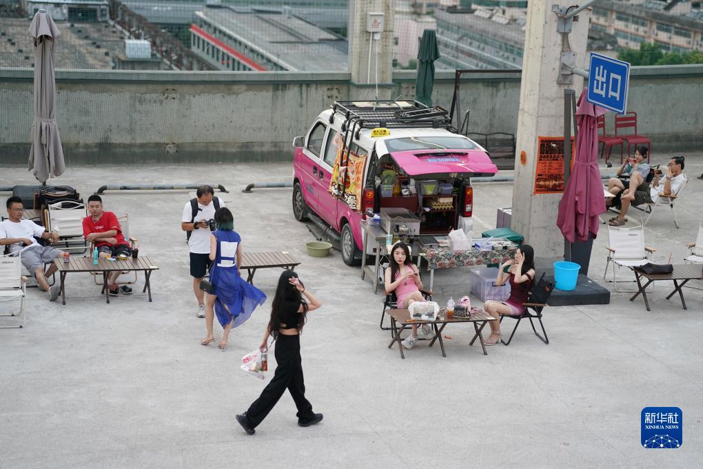 7月26日,年輕人在一棟由停車樓頂層改造而來的飲品店內消費休閑。