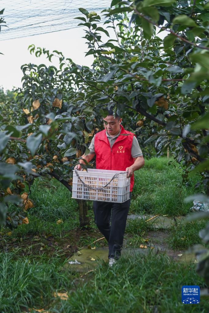 8月1日,黨員志愿者在湖州市東林鎮三合村的蜜梨種植基地幫助種植戶搶收蜜梨。