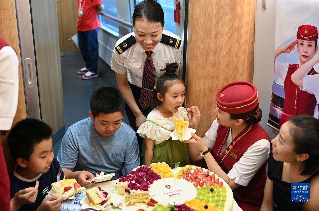 8月1日,天津客運段的乘務人員在京津城際列車上給小朋友喂蛋糕。