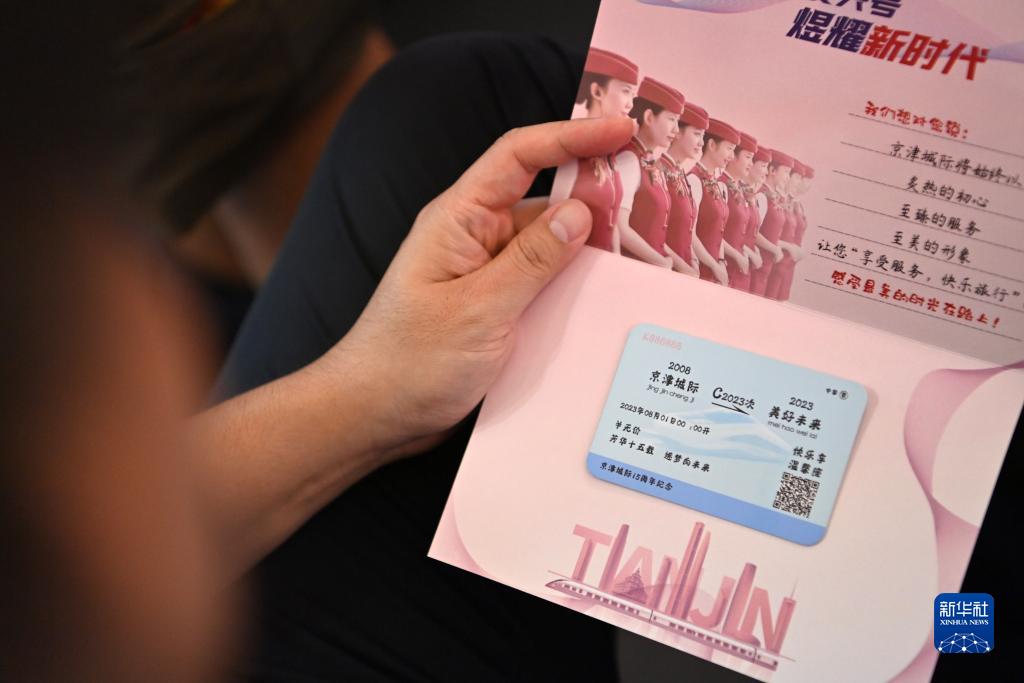 8月1日,乘坐京津城際列車的旅客在查看紀念冊。