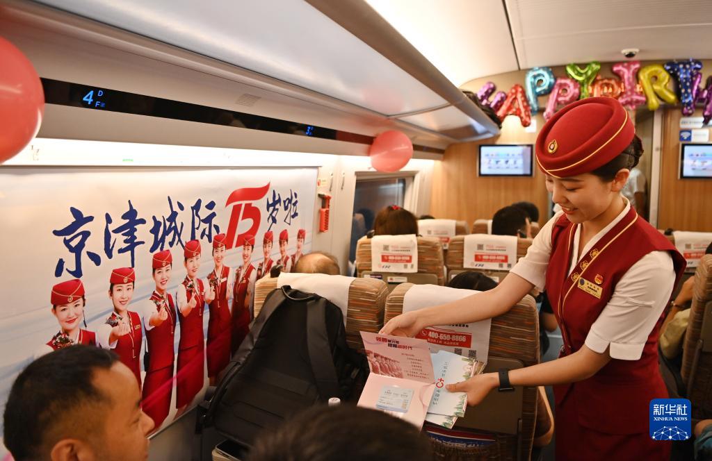8月1日,天津客運段的乘務人員在京津城際列車上給旅客發放紀念冊。