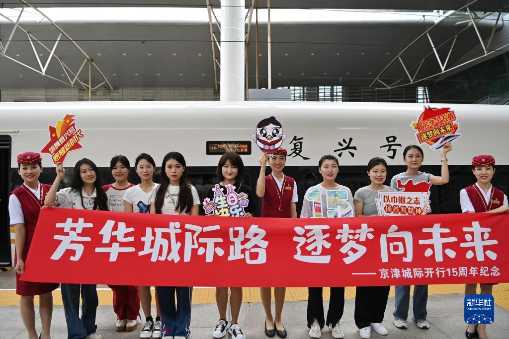 8月1日拍攝的在天津站舉行的京津城際開行15周年紀念活動一景。