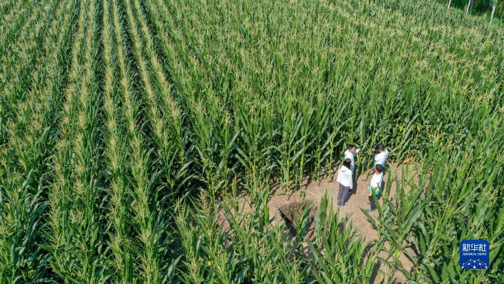 7月31日,在位于吉林省四平市梨樹縣的中國農業大學“科技小院”保護性耕作試驗田,幾名學生查看玉米生長情況(無人機拍攝)。