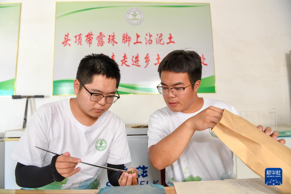 7月31日,在位于吉林省四平市梨樹縣的中國農業大學“科技小院”,在讀博士生沙野(右)和在讀碩士生蔣家偉在測量保護性耕作玉米樣本數據。