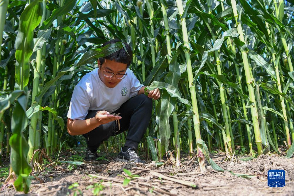 7月31日,在位于吉林省四平市梨樹縣的中國農業大學“科技小院”保護性耕作試驗田,在讀博士生沙野在查看秸稈覆蓋情況。