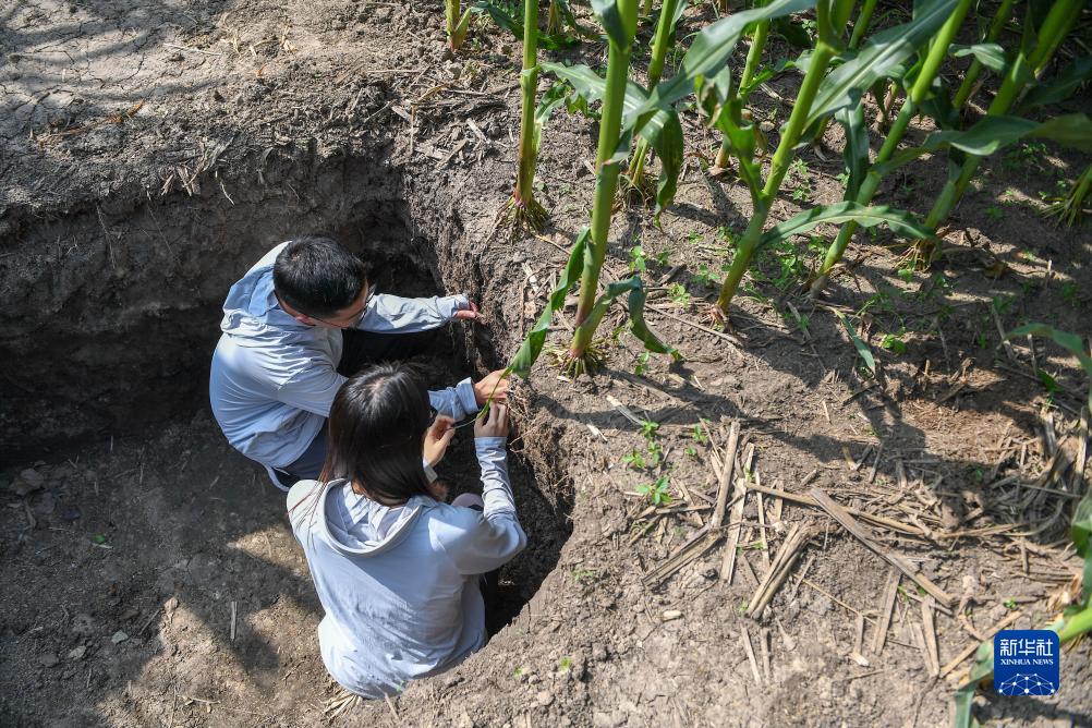 7月31日,在位于吉林省四平市梨樹縣的中國農業大學“科技小院”保護性耕作試驗田,在讀博士生胡文朗(左)和在讀碩士生張凈然在查看玉米根部生長情況。