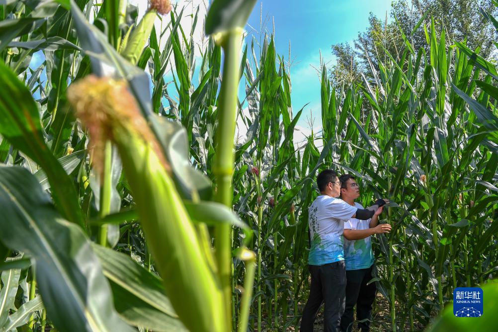 7月31日,在位于吉林省四平市梨樹縣的中國農業大學“科技小院”保護性耕作試驗田,在讀博士生沙野(右)和在讀碩士生蔣家偉在查看玉米生長情況。