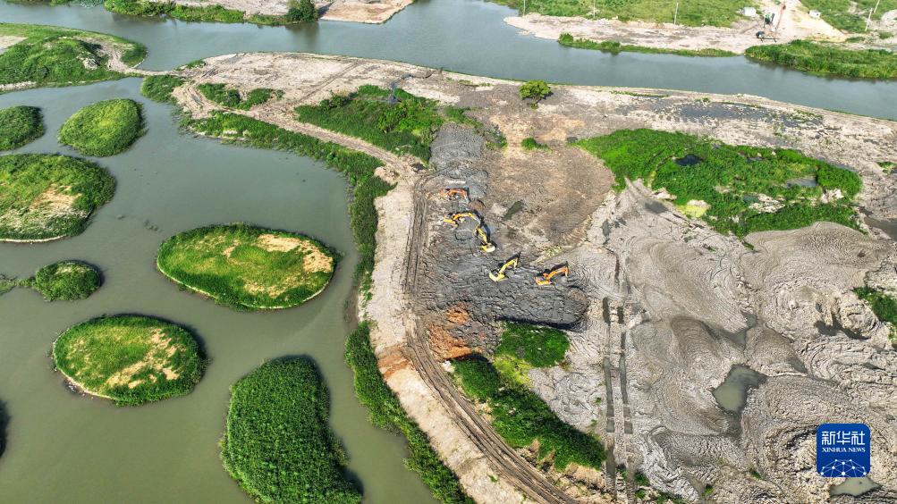 7月31日,在德清縣康乾街道金鵝湖濕地公園施工現場,挖掘機在進行土方開挖工程作業(無人機照片)。