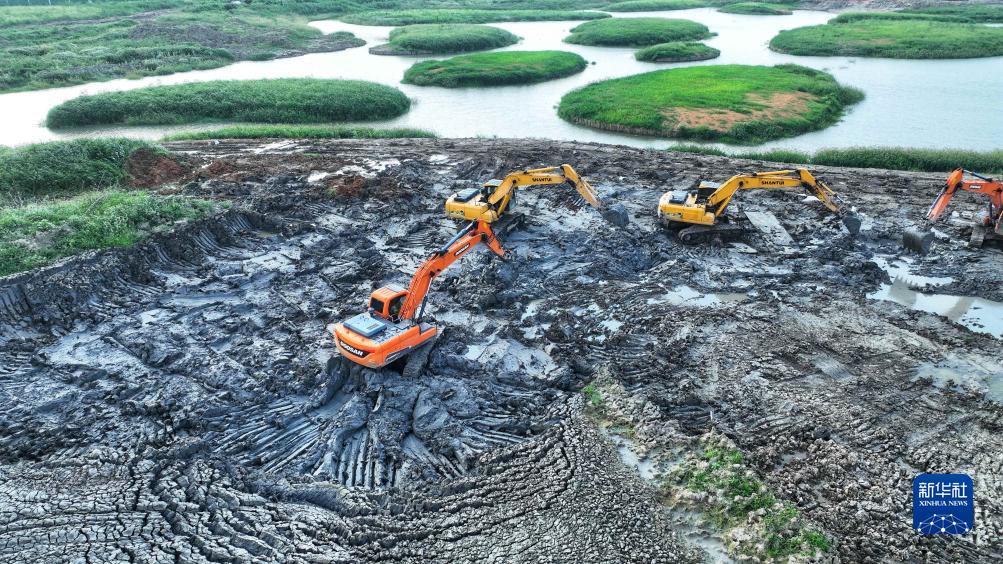 7月31日,在德清縣康乾街道金鵝湖濕地公園施工現場,挖掘機在進行土方開挖工程作業(無人機照片)。