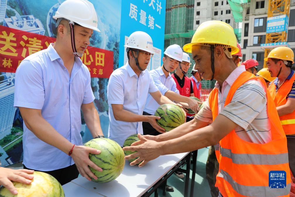 8月1日,中建二局合肥林店家園安置房項目部為工友發放西瓜。