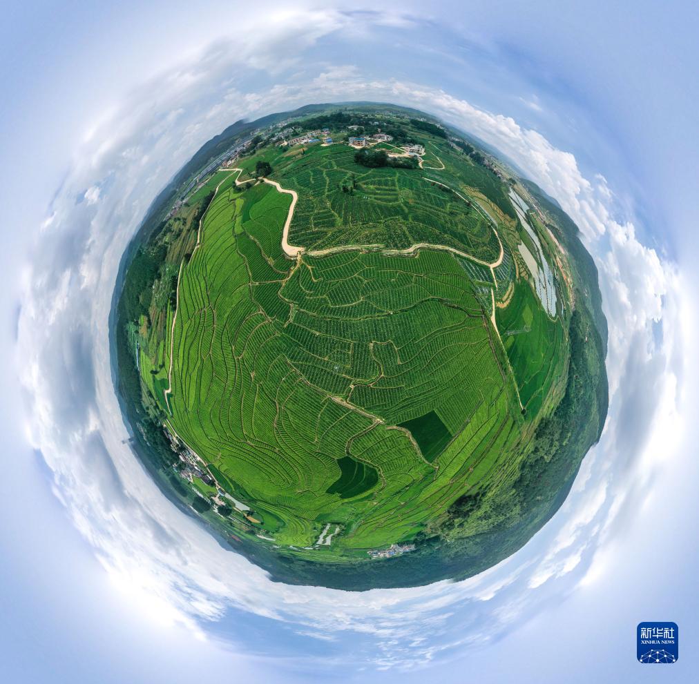 這是8月1日拍攝的貴州省岑鞏縣水尾鎮新場村雜交水稻制種基地(無人機全景照片)。